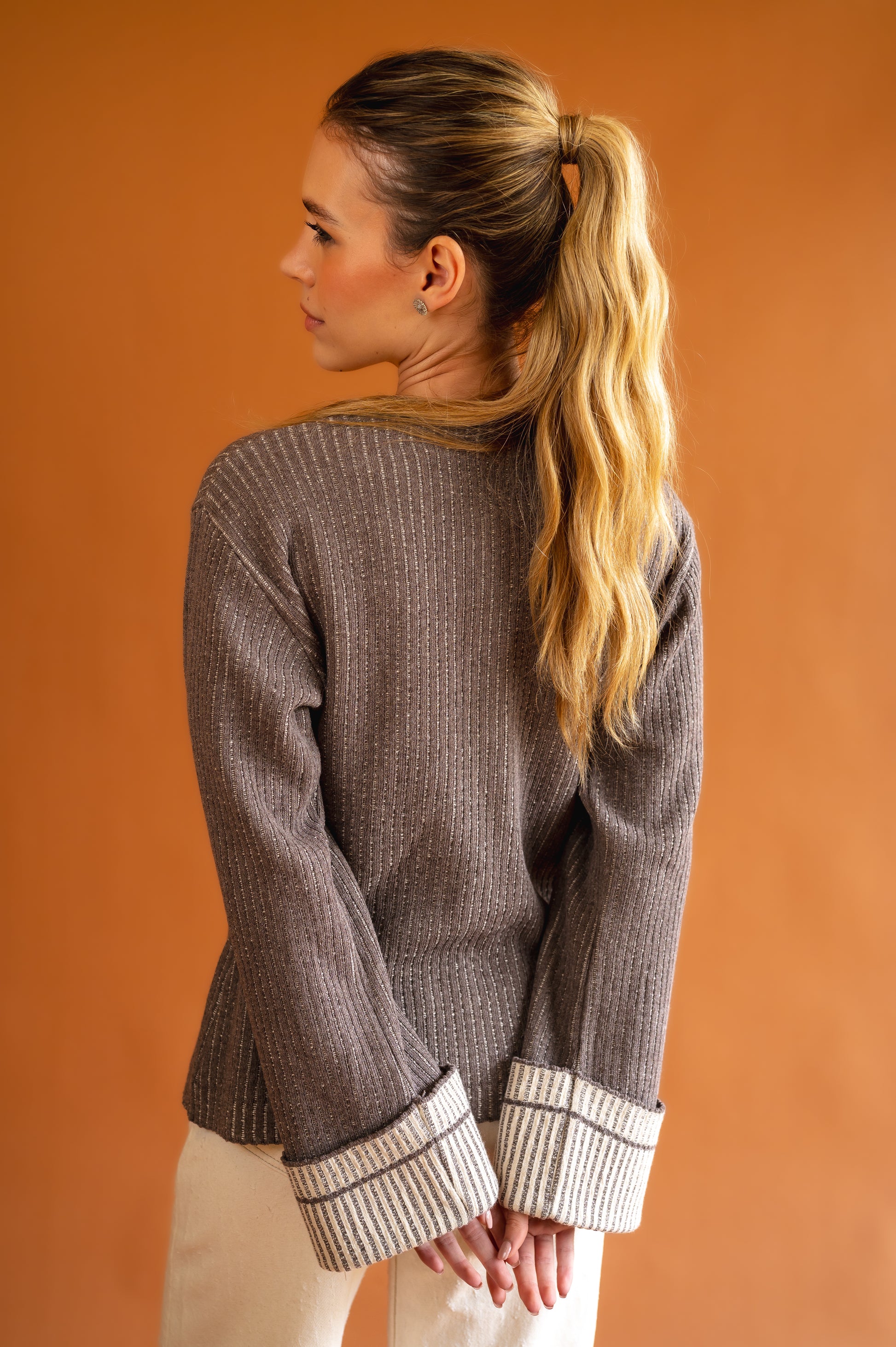 Cardigan acanalado tejido en algodón y PET reciclado, suave al tacto, botones antiguos.
