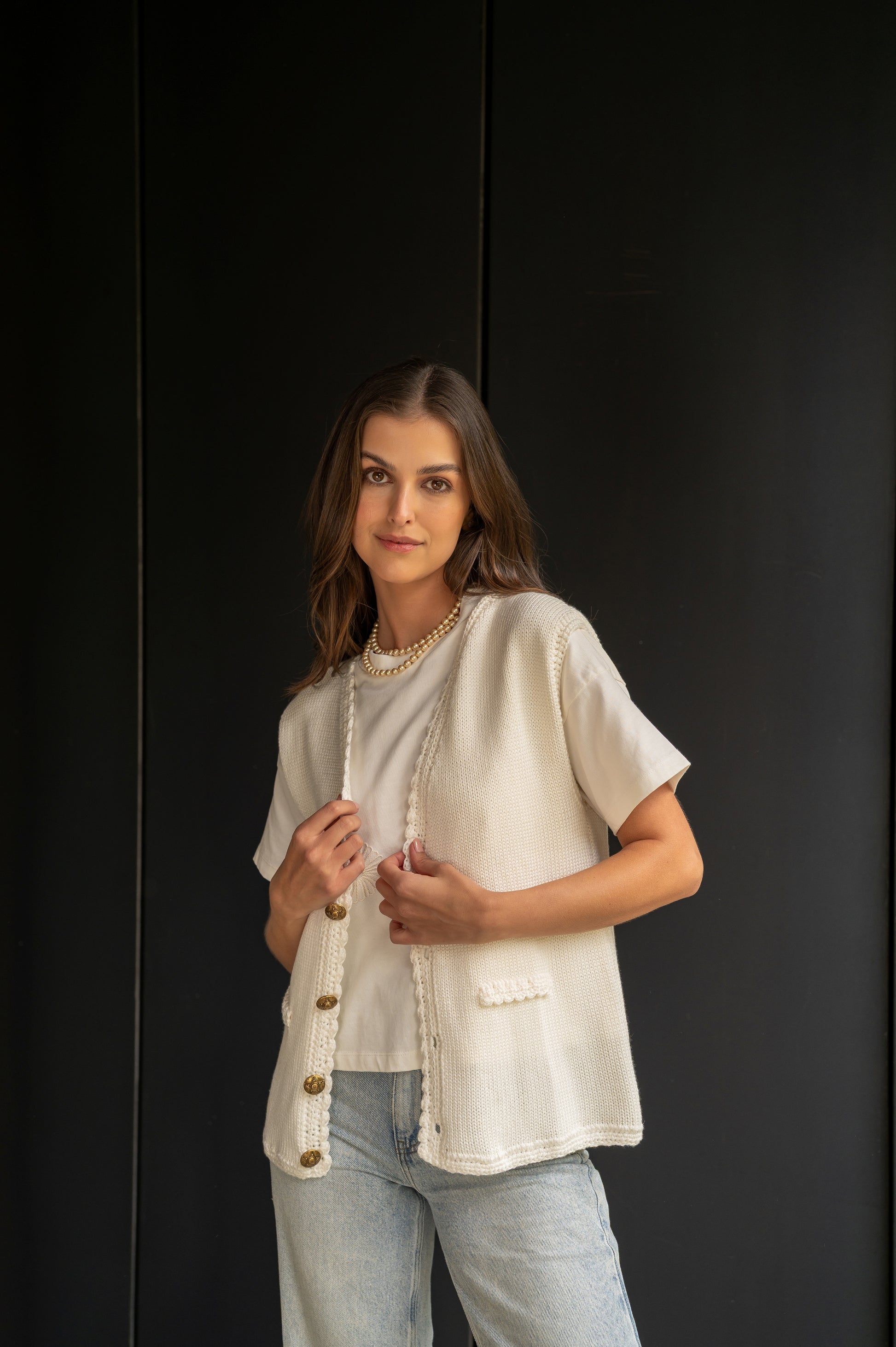 Chaleco tejido en viscosa y acrílico, crochet en bordes y botones dorados.