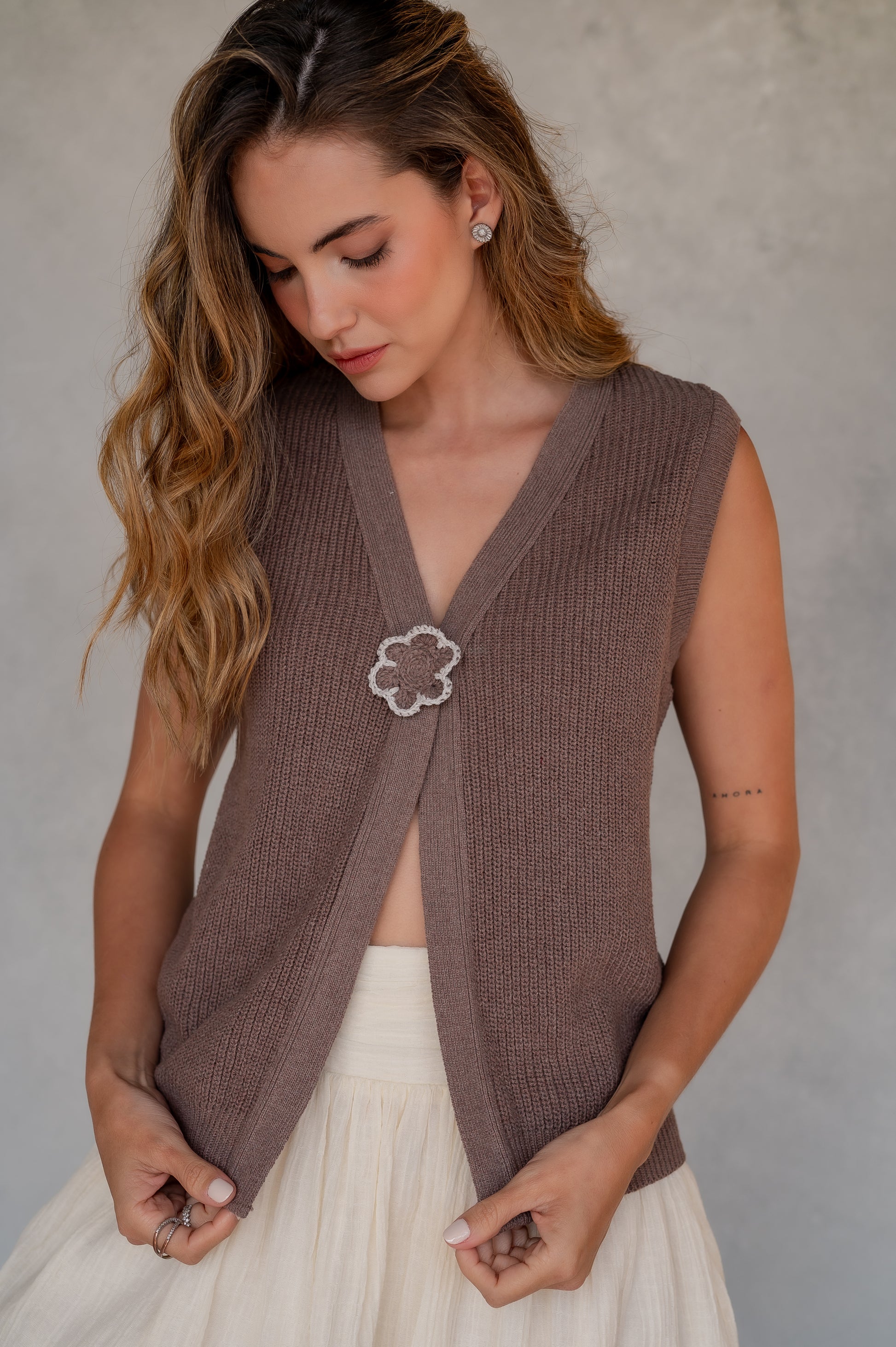 Chaleco tejido en algodon y PET reciclado con broche y flor hecha en crochet a mano.