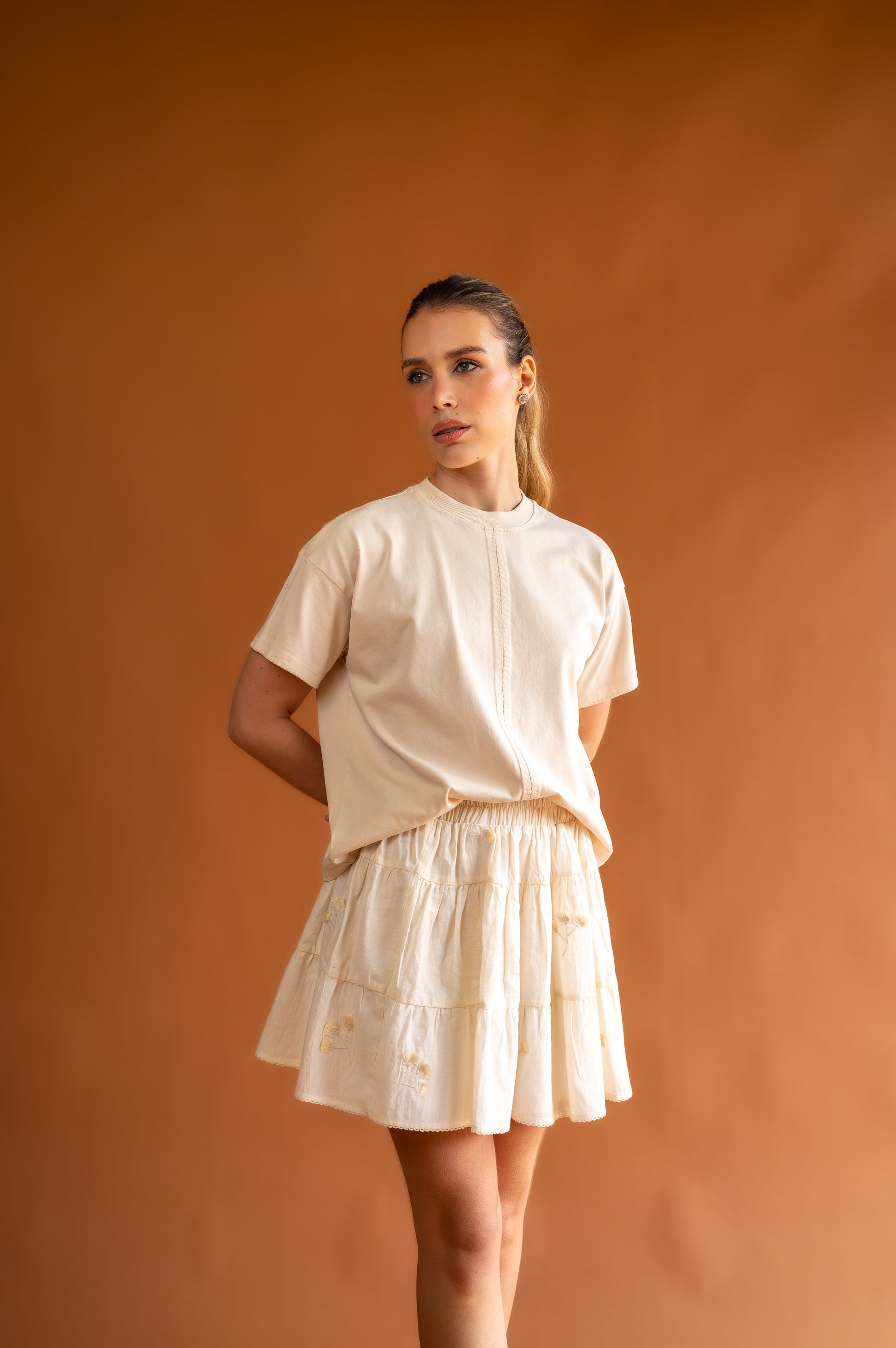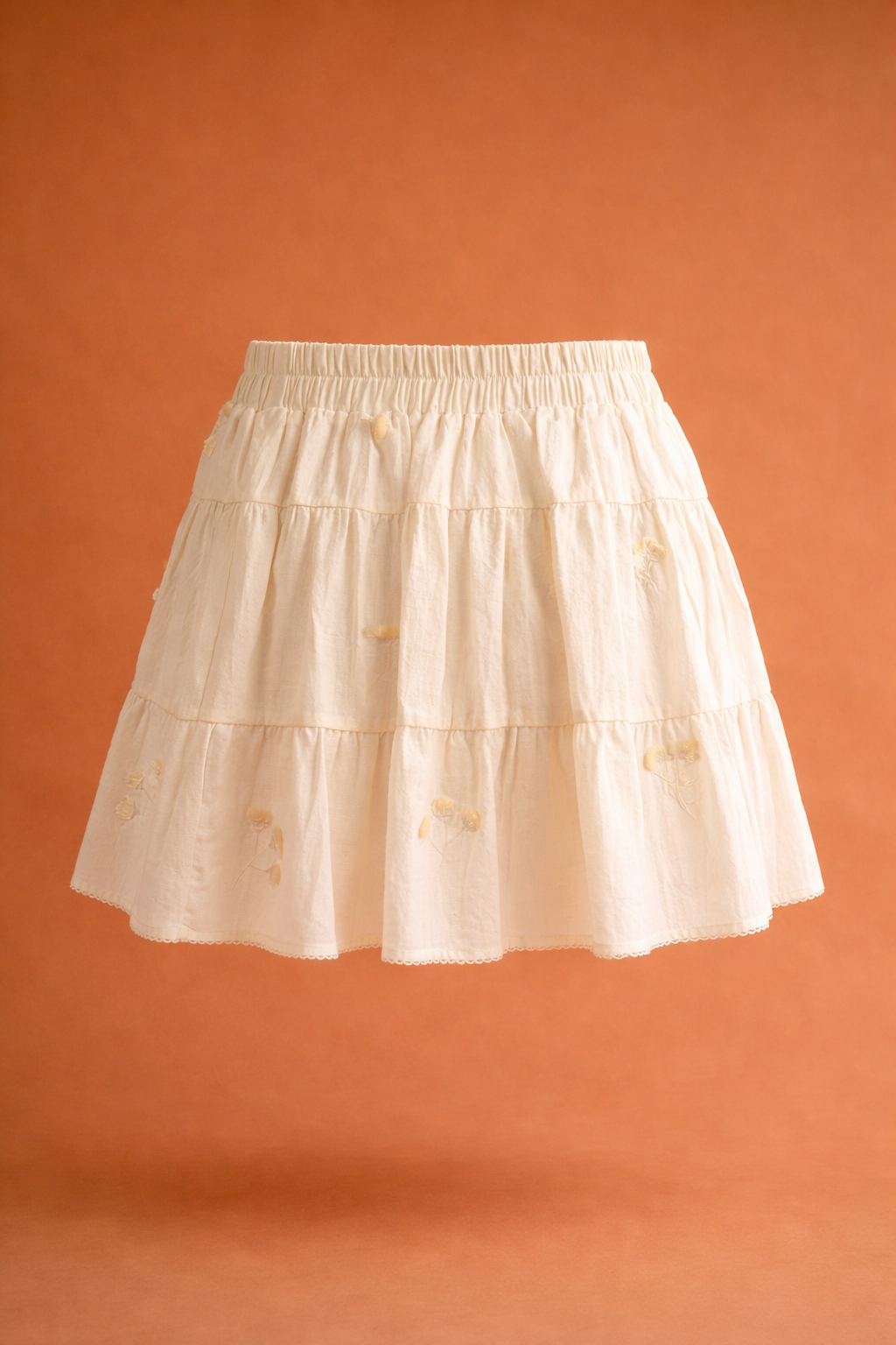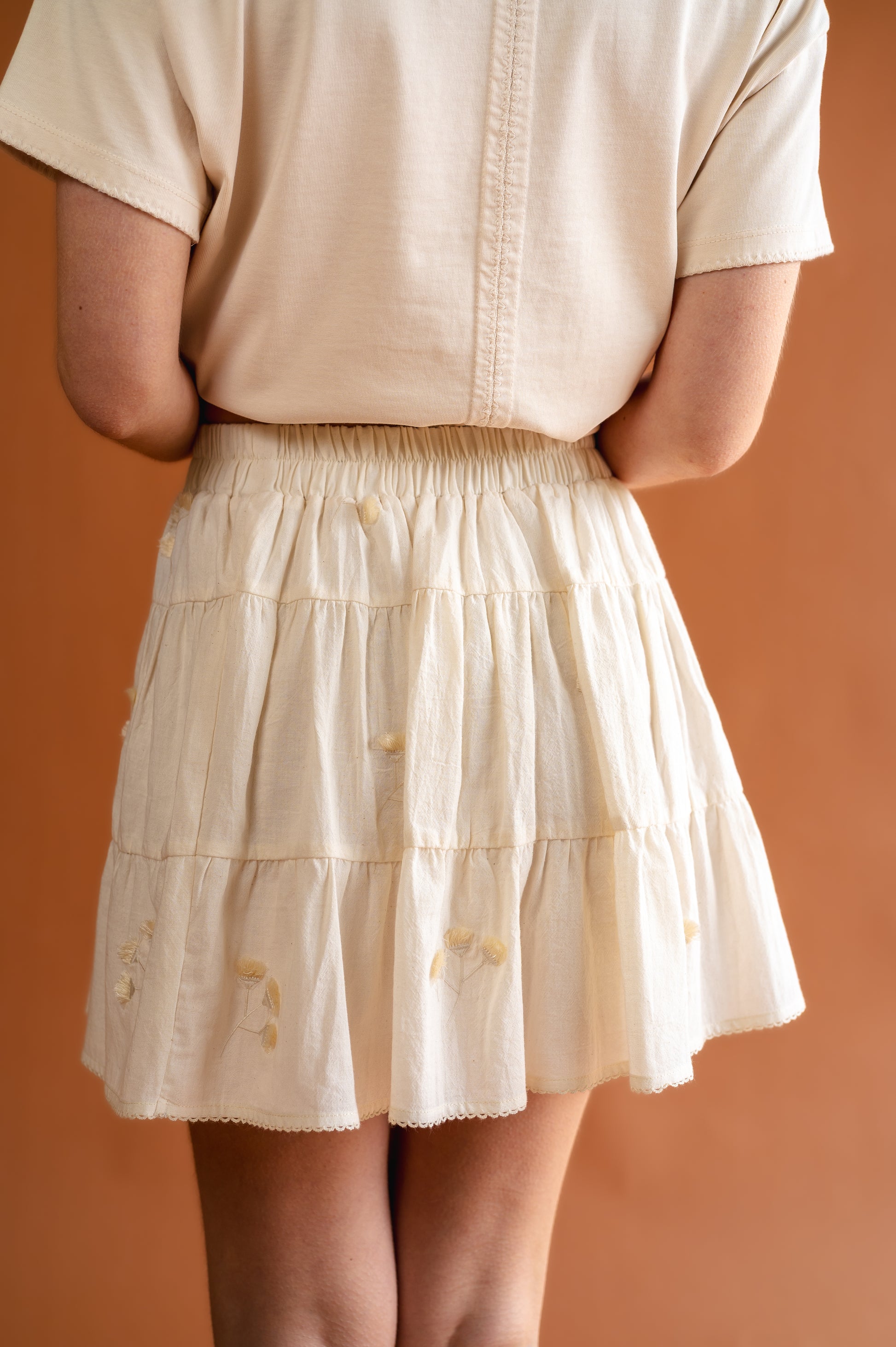 Falda en 100% algodón con bordados, elástico en pretina, forro interno.