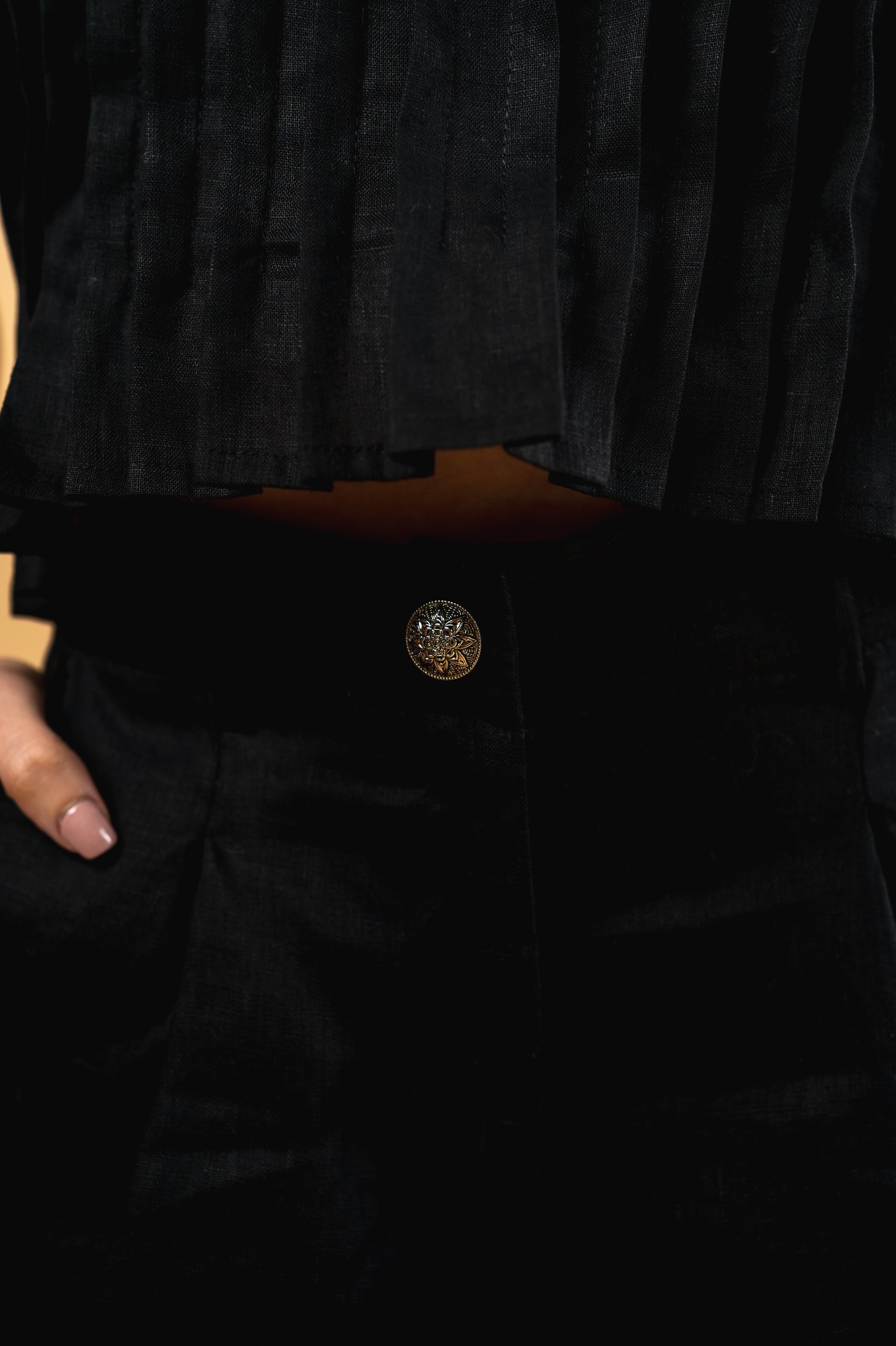 Shorts en 100% lino, bordados en bolsillo y ruedo, botón dorado. PREVENTA. Esta prenda se entrega desde el 6 de diciembre.