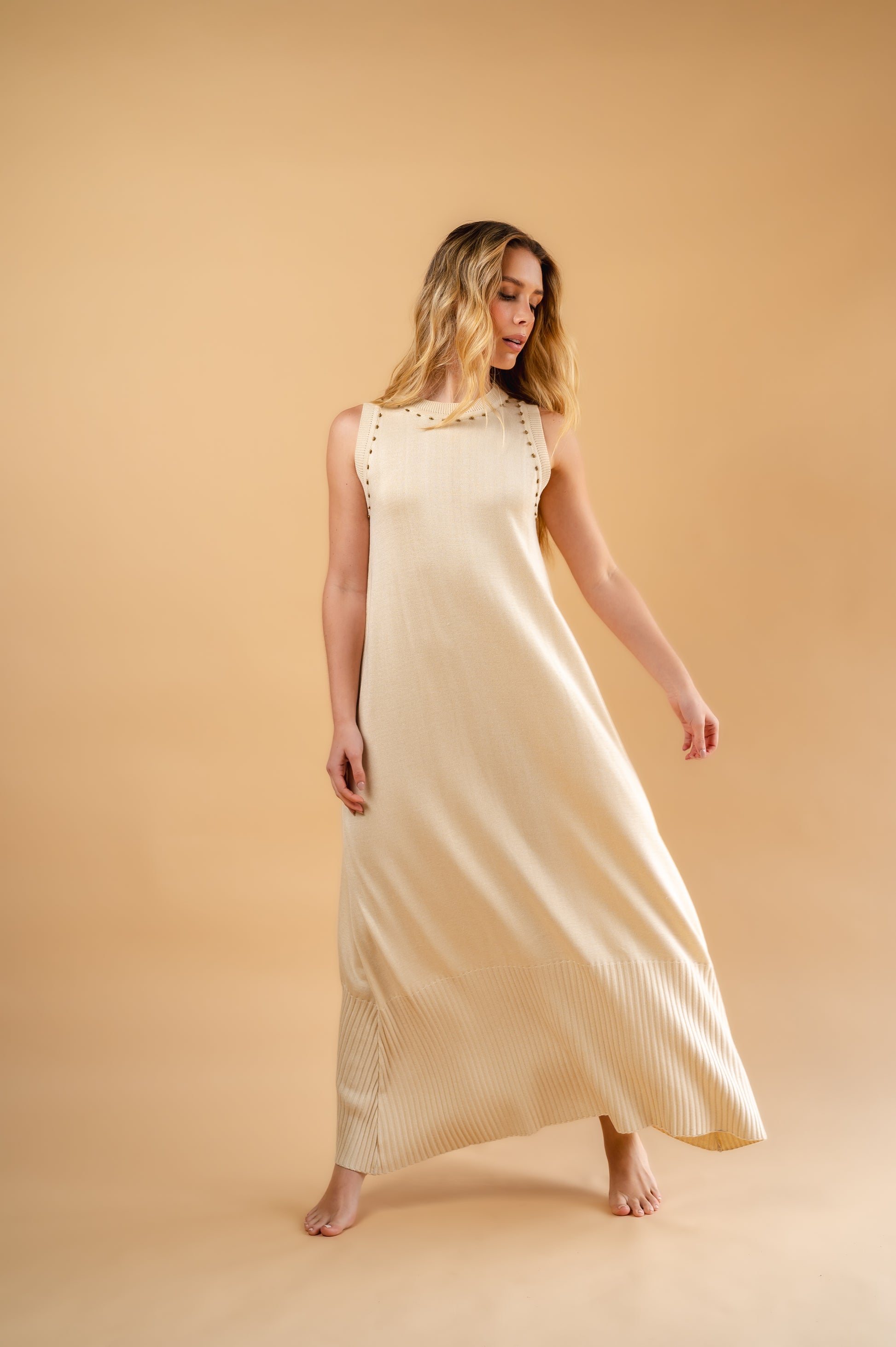 Vestido largo tejido en viscosa y acrílico, tejido acanalado en la parte de abajo, bordado a mano con mostacillas doradas.